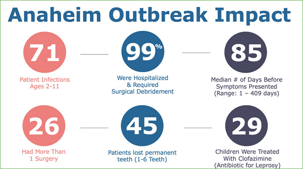 Since 2015, there have been nearly 100 confirmed cases of infection linked directly to dental waterline contamination. Most notably was the outbreak in Anaheim, California, where 72 healthy children, ages 2-12, were infected with mycobacterium abscessus, a similar bacteria to those causing tuberculosis and leprosy. Children lost permanent teeth, were prescribed heavy doses of antibiotics, and many required surgeries to remove parts of their jaw. Multiple practices were permanently closed, lawsuits were filed, and long-built reputations were ruined. The aftermath received national news coverage, including on CNN, NPR, and Good Morning America.